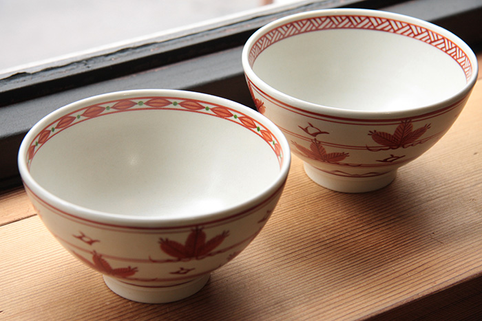 赤絵で書き込まれたデザインが、伝統の凄みを感じるウツワたち。
