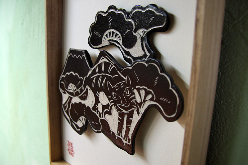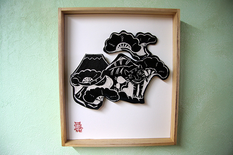 虎と松と富士山を型取り、さらに掻き落としを施した緻密な作業が窺える作品。